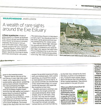 This weekend's Independent on Sunday carried its monthly extract from 52 wildlife weekends. For April it chose South Devon - where Sand Crocus and Sand Lizard vie for your attentions with rockpooling and Cirl Buntings.